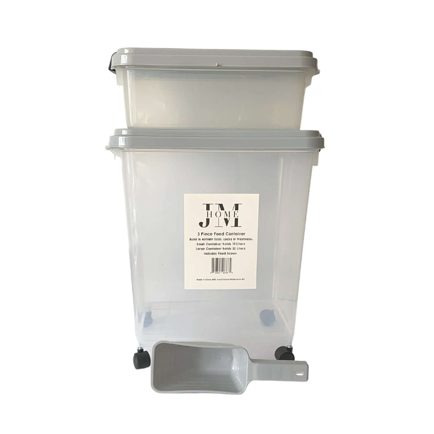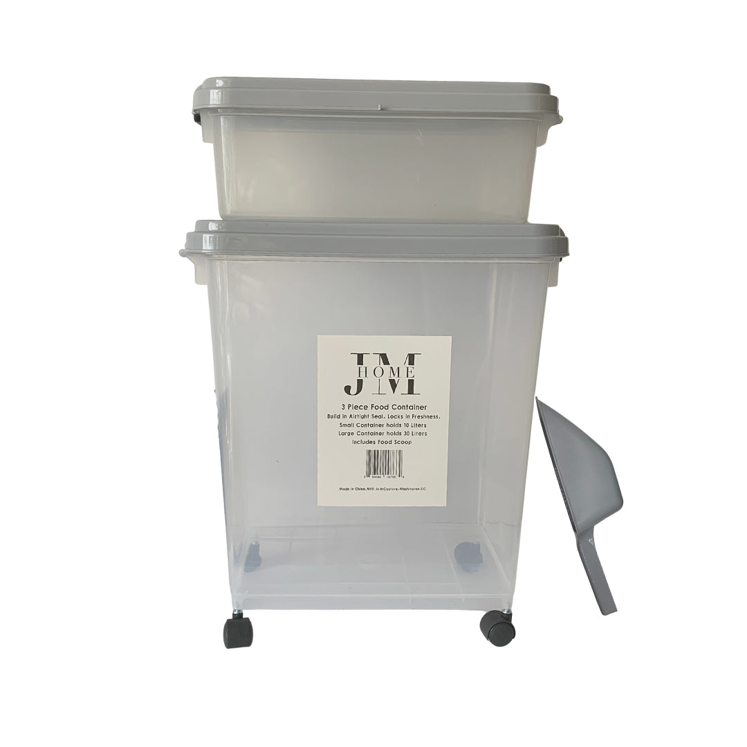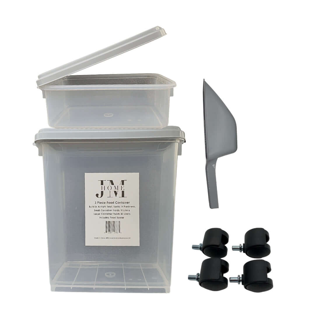 Get every paws on the most paw-some dog food storage system on the market our Stackable 3-Piece Plastic Dog Food Container/Organizer Set. This 3-piece stackable storage solution is made of high quality, BPA Free durable plastic. The 4 wheels make maneuvering a breeze through kitchens, garages, pantries or wherever food is stored.