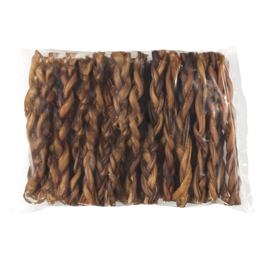 The braided texture offers added toughness and promotes dental health by helping scrape away plaque and tartar during chew sessions. Packed in a 25-count bulk pack, these triple braided bully sticks are perfect for natural pet stores, groomers, and country-style retailers looking for high-turnover natural chews.