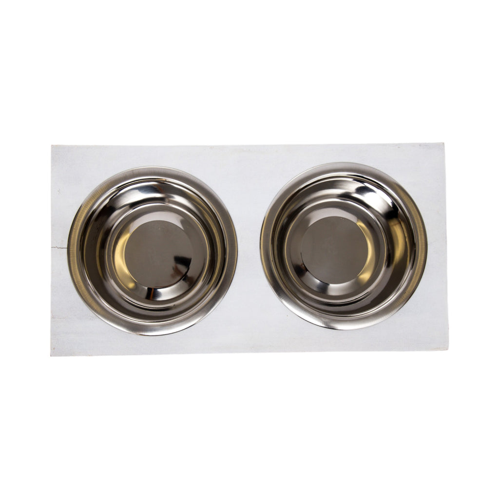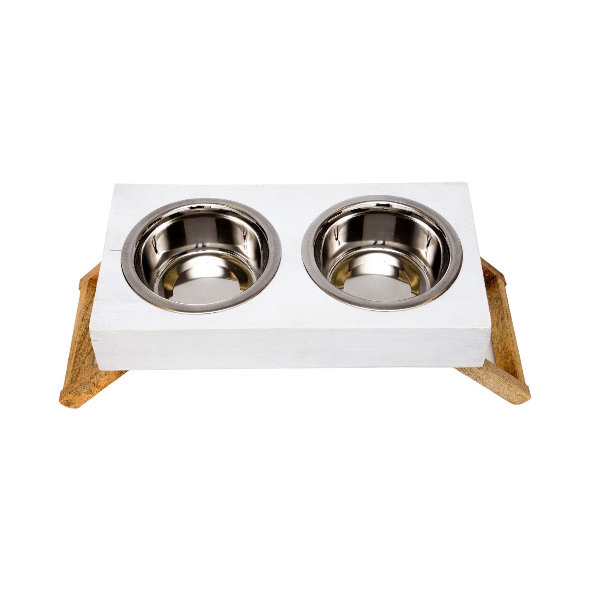 Enhance your product lineup with this stylish and eco-conscious elevated dog feeder, expertly crafted from premium solid mango wood. The polished finish highlights the distressed white color, adding a touch of elegance to any home, while the durable stainless steel bowls (12 oz. for Small and 24 oz. for Medium) provide a practical, easy-to-clean feeding solution.