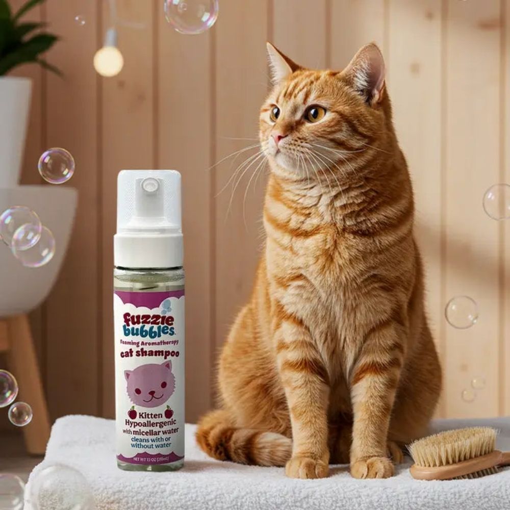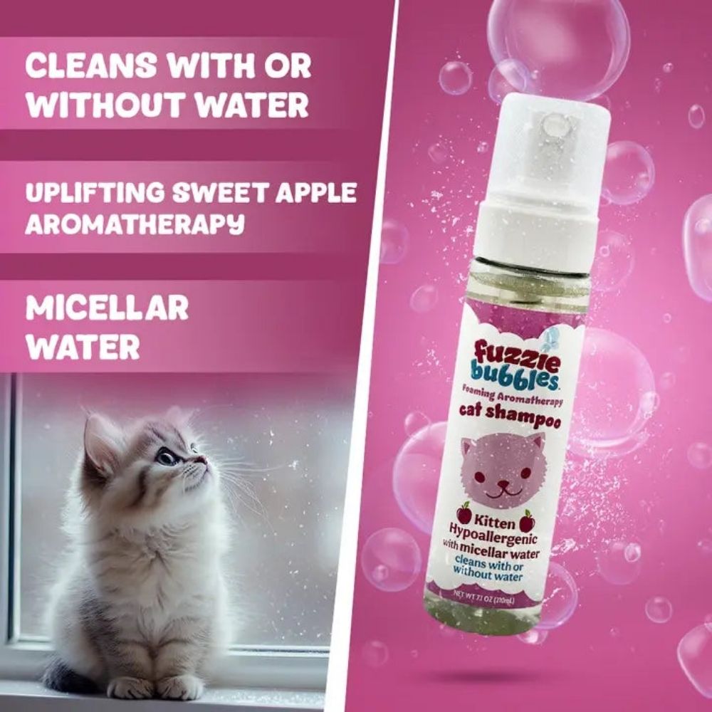 Fuzzie Bubbles Kitten Hypoallergenic Foaming Aromatherapy Cat Shampoo is a gentle, waterless or rinse-off solution made for kittens and sensitive cats. This all-natural formula cleans with or without water—no dilution or rinsing needed. Infused with Micellar Water for deep but gentle cleansing, it lifts dirt and odors without irritating delicate skin. Avocado oil, coconut oil, and aloe leaf juice help nourish and moisturize, while a light aromatherapy scent calms and comforts. Packaged in a 7.1 oz foaming pump bottle—perfect for bath-averse pets, travel, or quick touch-ups.