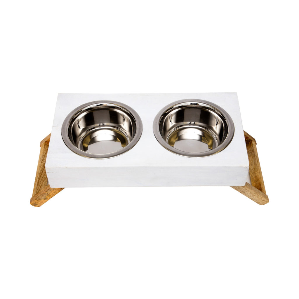 Enhance your product lineup with this stylish and eco-conscious elevated dog feeder, expertly crafted from premium solid mango wood. The polished finish highlights the distressed white color, adding a touch of elegance to any home, while the durable stainless steel bowls (12 oz. for Small and 24 oz. for Medium) provide a practical, easy-to-clean feeding solution.
