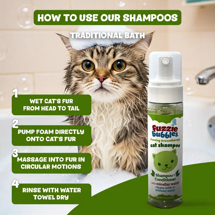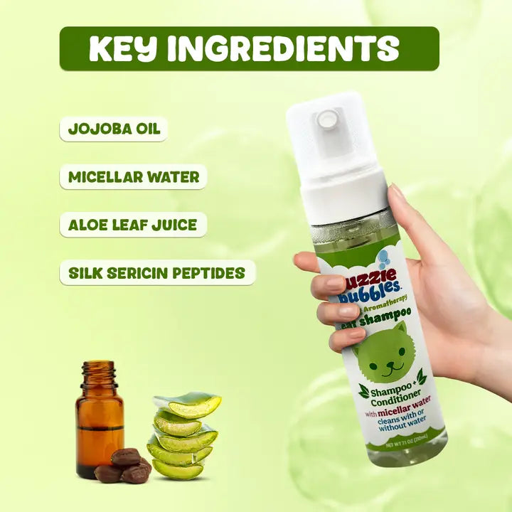 Fuzzie Bubbles Shampoo + Conditioner Foaming Aromatherapy Cat Shampoo is a 2-in-1, all-natural grooming solution designed for cats of all ages. This unique foaming formula works with or without water—ideal for bath-averse cats, quick cleanups, or travel. Powered by Micellar Water for deep yet gentle cleansing, it combines hydrolyzed keratin, aloe, and oatmeal extract to condition, soothe, and hydrate the coat. No mixing or dilution required—just pump, massage into the coat, and towel dry or rinse. Packaged in a 7.1 oz bottle, ready for retail or take-home use.